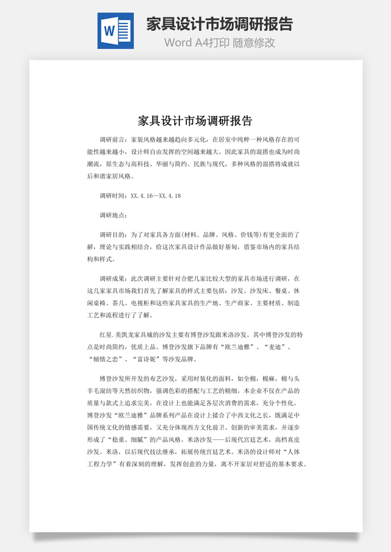 本模板为家具设计市场调研报告word文档,文字图片可以直接替换,使用简单方便