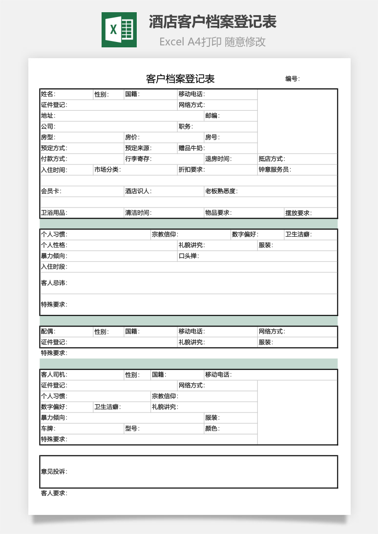 本模板为酒店客户档案登记表,文字图片可以直接替换,使用简单方便