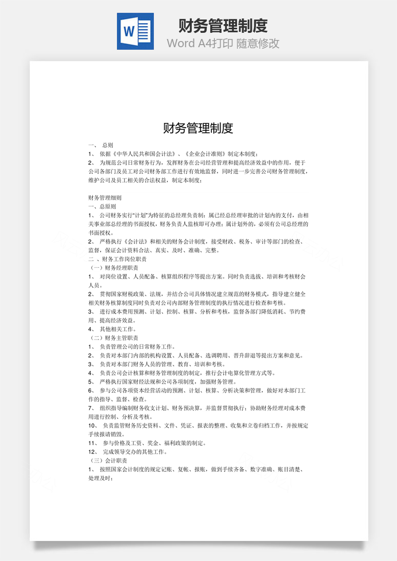 本模板为财务管理制度Word文档,文字图片可以直接替换,使用简单方便